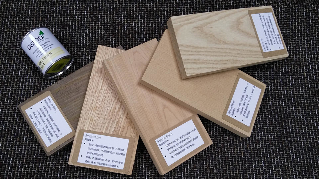 上圖展示木材最天然的狀態, 沒有染色, 沒有塗上任何塗層, 由左至右分別是黑胡桃木, 紅橡木, 櫻桃木, 櫸木及白蠟木. 加上塗層後一般會變深色些.