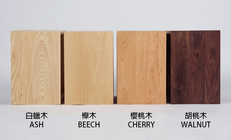 白蠟木或水曲柳 (Ash) / 櫸木 (Beech) / 樺木 (Birch) / 楸木 (Catalpa) / 櫻桃木 (Cherry) / 榆木 (Elm) / 楓木 (Maple) / 橡木 (Oak) / 松木 (Pine) / 花梨木 (Rosewood) / 橡膠木 (Rubber Wood) / 柚木 (Teak) / 胡桃木 (Walnut)