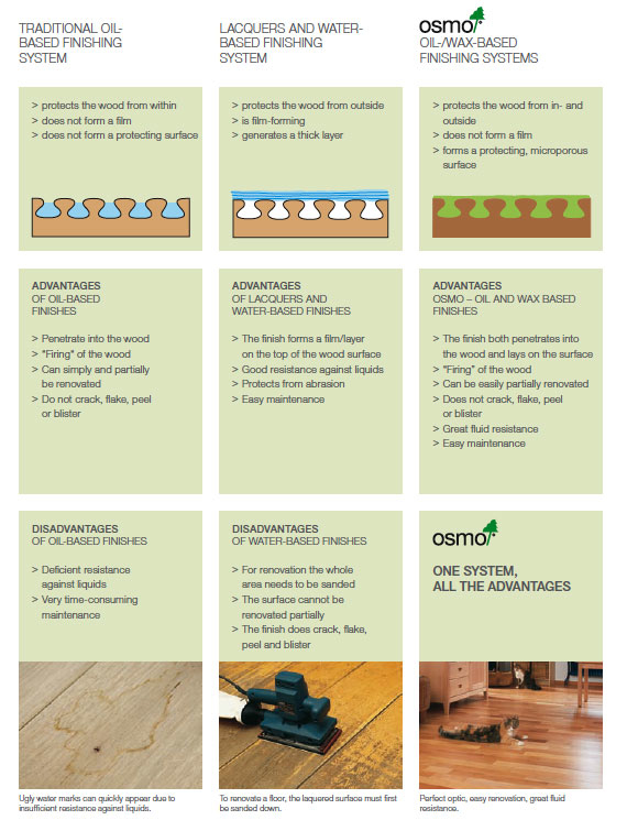 傳統漆油: 把木材完全密封, 表面較滑, 保護性及防水力相對較高, 缺點是失去原木質感, 對於括花等難以修復.